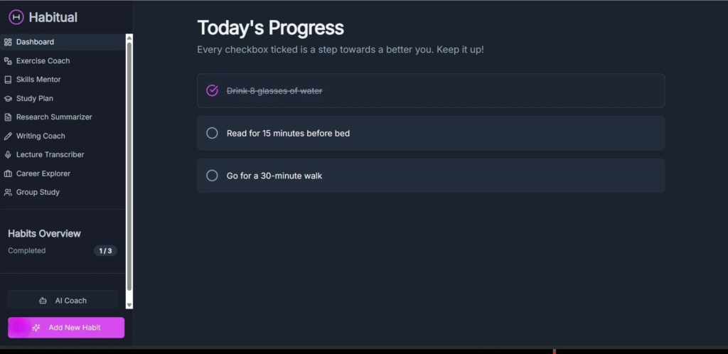 The Solution: We developed “Habitual,” a platform that combines traditional habit tracking with an integrated AI Coach. The system features specialized modules like the Research Summarizer and Lecture Transcriber to help users integrate learning into their daily routines seamlessly.